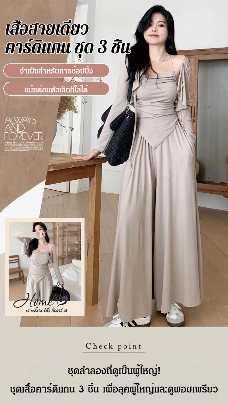 ชุดเซ็ทคาร์ดิแกนเสื้อสายเดี่ยว ชายเสื้อไม่สม่ำเสมอ ชุด 3 ชิ้น ดูผอม สำหรับผู้หญิง